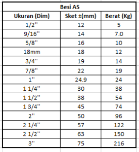 Besi AS adalah besi yang populer yang dapat digunakan untuk banyak aplikasi. Disebut juga dengan istilah Shafting Bar, Bar Stock, dan round bar, besi ini memiliki bentuk bulat dengan panjang standard 6 meter. Karena kekuatannya yang kokoh dan tidak mudah patah, Besi AS sering digunakan menjadi bahan utama pada sparepart kendaraan mobil besar maupun kecil, dan juga pada mesin-mesin pabrikan. Besi As tersedia dalam berbagai ukuran.